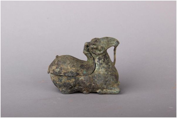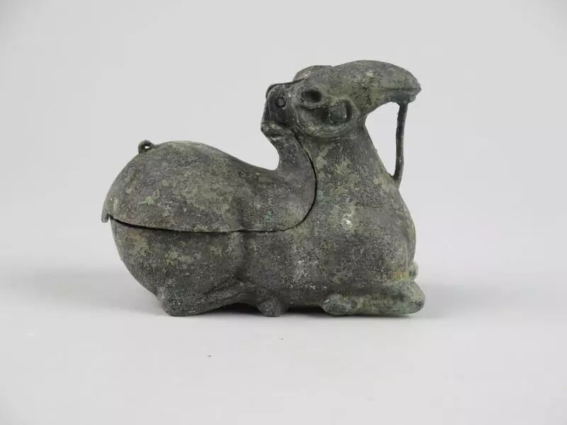 此件羊灯出土于忠县㽏井遗址,整体卧羊形,羊首高昂,目视前方。羊角大而盘卷,曲成环状紧贴面颊,额下胡须自下额垂至颈部。身躯肥圆。四肢健壮,前腿后跪,后腿前屈,臀部肥硕,短尾。羊的背部和身躯分铸为两部分,羊躯内空,可储放燃油。羊脖后铸有活钮,臀后铸有提钮,羊背可以活动自如地翻开平放在羊头上,成为半圆形内凹的灯盘,盘心短锥用来挂置灯捻。灯盘在靠活钮端设有小流嘴,熄灭时,只需扣合灯盘,灯火就会自动熄灭,残烟由此封闭,避免呛人,方便小巧,而剩余的灯油顺沿小流嘴流入腹腔内,羊背部与腹部相扣合,恢复为完整跪羊状。美观精巧、稳重古朴,恰到好处地表现出羊的温顺之性与安详之态,十分惹人喜爱。