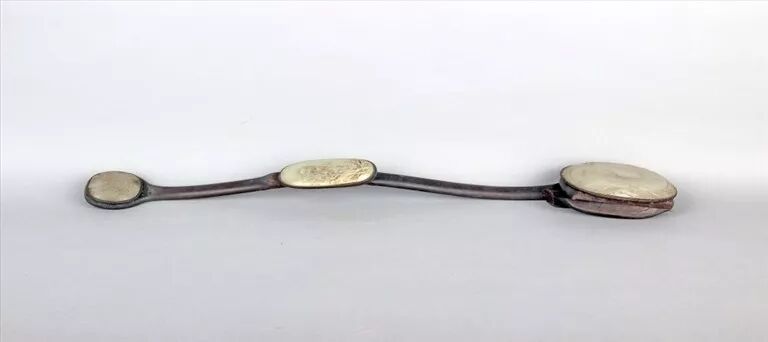 这件镶木玉如意是忠县新生人秦仲皋先生捐赠的。其造型整体呈灵芝状,柄首、柄中部及柄尾镶嵌三块青白玉,造型优美别致,生动活泼。柄首部玉上雕刻蝙蝠,柄中部玉上雕刻牡丹,柄尾部玉上雕刻梅花。这些图案也是富贵、吉祥、福禄的象征,寓意深刻。