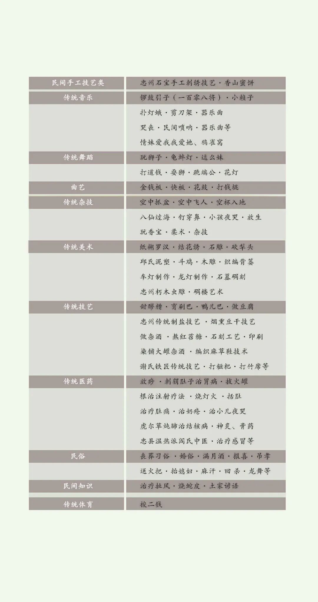 忠县非物质文化遗产是忠州地区古老的生命记忆,是忠州人心中抹不去的记忆和宝贵的精神财富。