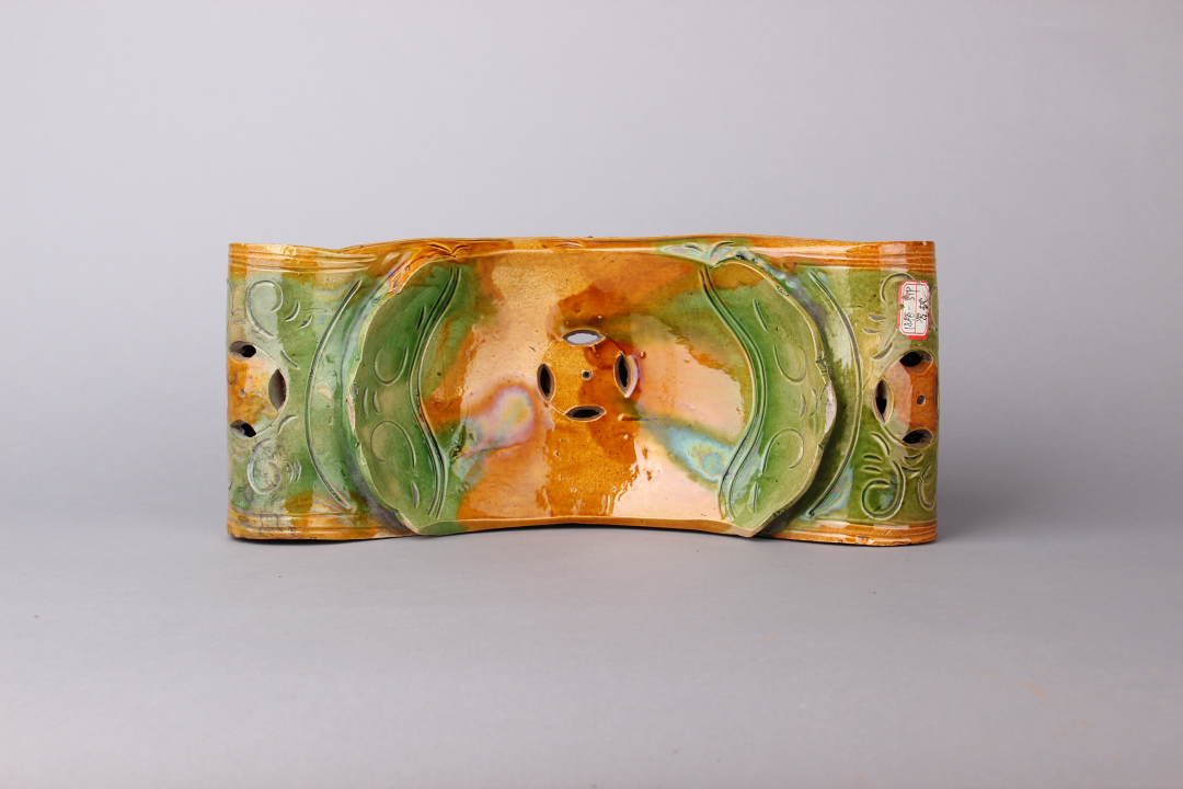 忠州博物馆收藏的这件明三彩瓷枕,长35.8厘米,宽15.3厘米,高9.5厘米,其整体呈长方形,正立面为元宝状,中部下凹,两端上翘,两端内侧有荷叶边装饰,四周和枕面通过刻花、镂空雕刻等手法,装饰有钱纹、花卉纹等,色彩鲜艳,造型优美,保存完整,是一件不可多得的藏品。