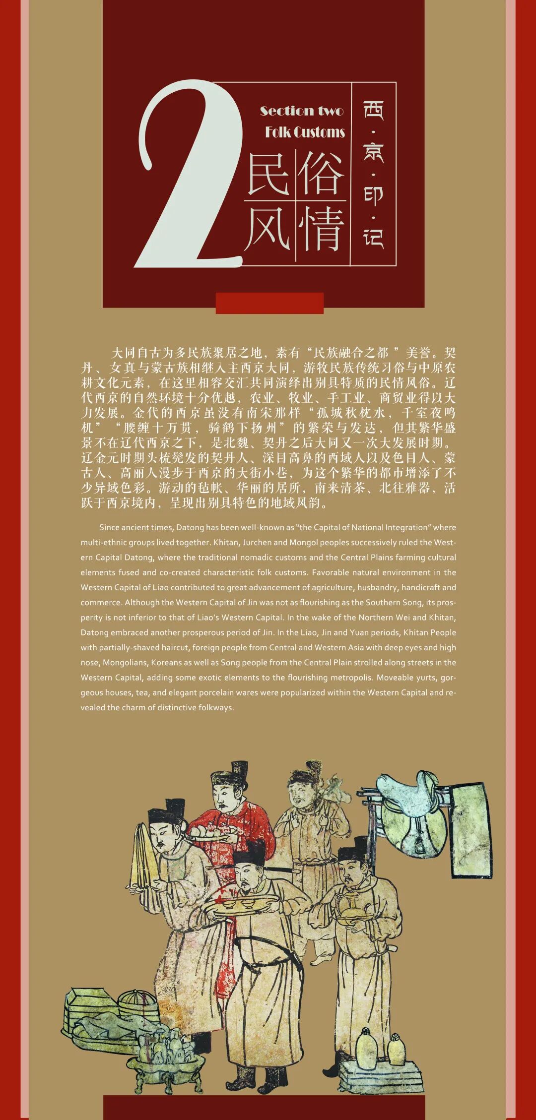 《西京印迹---大同辽金元文物展》以民族融合为主题,精选大同市博物馆馆藏辽金元时期珍贵文物,从不同角度为观众讲述了辽金元时期人们春夏耕作、秋冬射猎、茶酒饮宴、家居逸乐的生活百态,奔放豪爽的游牧民族特质与内敛儒雅的中原文化气息相汇相融、碰撞生息,共同勾勒出辽金元时期西京大同民族融合的盛世风貌。
