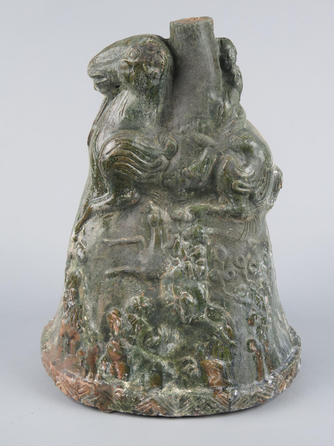 此件摇钱树座,通高43.4cm,底宽33.8cm,呈圆锥状,上小下大,中空无底座,造型为仙人骑羊,通体施以绿釉。古时 “羊” 字音通 “祥 ”, 故古人常用羊的形象或羊头的图案来表示 “吉祥”, 并将其镌刻或模印在画像石与图像砖上, 这种形式在四川地区的汉代墓葬中最为常见。骑羊的仙人为汉代图像中常见的“羽人”,在秦汉时期,长生不死之神仙传说盛行,秦始皇和汉武帝对此类传说深信不疑,认为可以通过求不死之药、修炼服丹等方法不死成仙,飞升天界,故身上有羽翼。这些摇钱树之所以埋藏在死者的墓中,因为其寄托着死者的某些祈求与心愿,如飞升仙界。纵观摇钱树座的形式和图像内容,反映出古人祈福求财,以及企望墓主人灵魂仙化升天的思想。