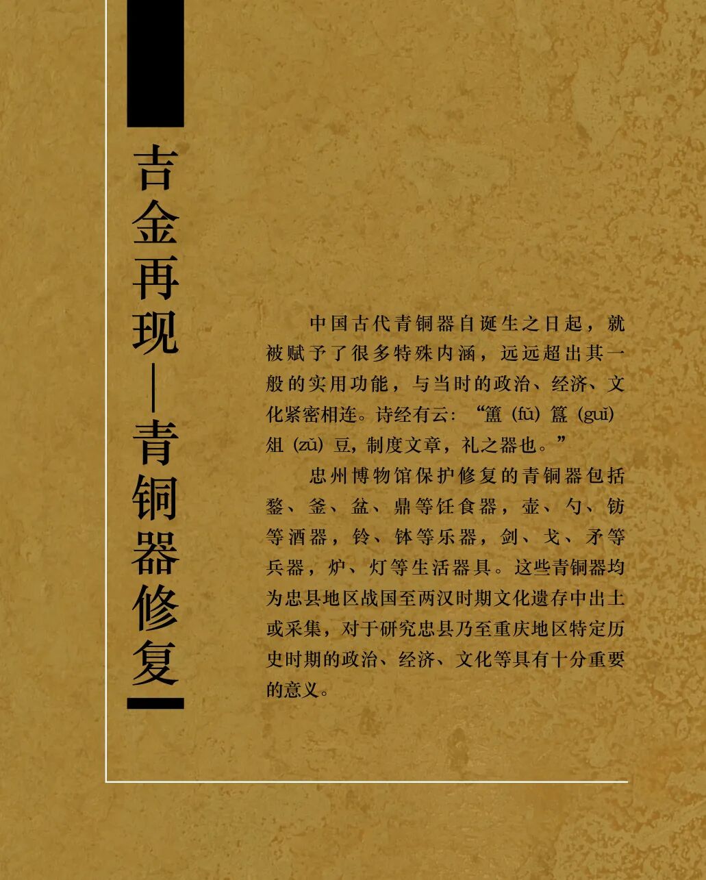 前两期“云观展”栏目连载了《手中方寸 执守初心——忠州博物馆陶、瓷、青铜器修复成果展》的陶器篇——周回陶钧和瓷器篇——瓷意千年,本期继续推出本展览第三期青铜器篇——吉金再现,以飨观众。